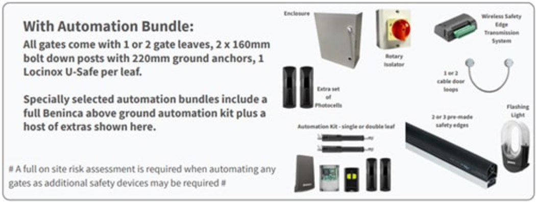 Automated gates come with the single or double gate leaf arrangement as required. 2 no. 160mm x 160mm bolt to floor posts with 220mm ground anchors and 1 Locinox U safe per leaf.