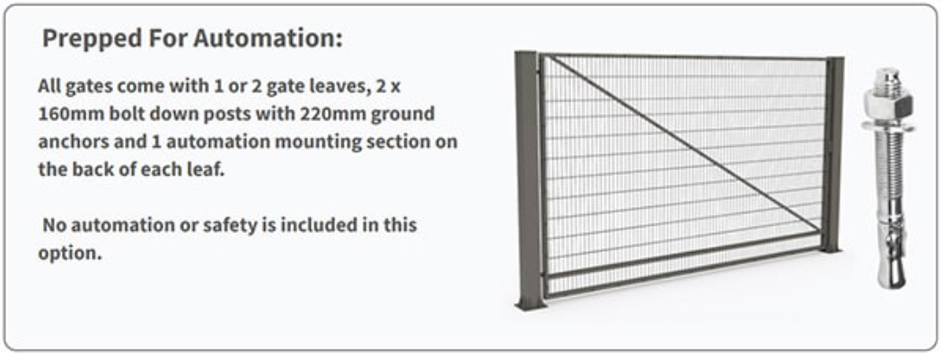 The manual pre-prepared for automation gates come with the single or double gate leaves as required, 2 no, 160mm x 160mm steel bolt down gate posts with 220mm ground anchors.