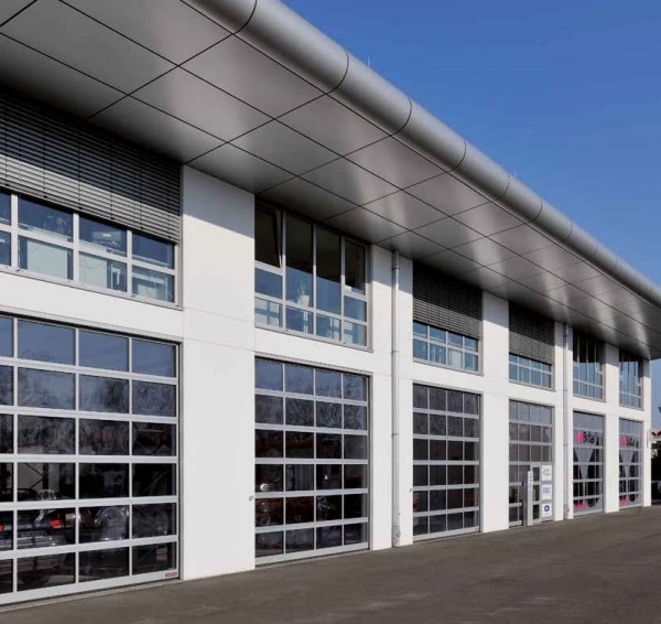 For businesses that require natural light and a modern aesthetic, Hörmann offers the ALR F42 fully glazed sectional door: