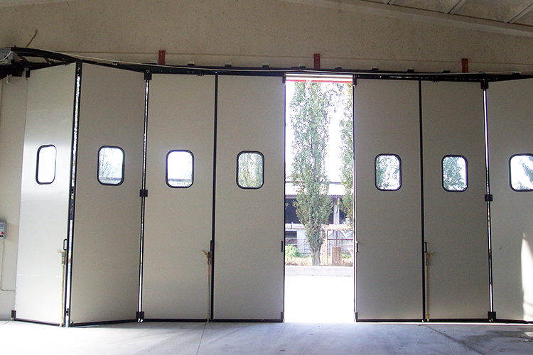 Our most popular industrial folding door, the Adone, is based on a side hinged panel arrangement with a top track to support the door leaves and guide them to their open and closed positions. This type of door arrangement ensures an almost completely free floor for trip free access and minimal components for longevity.