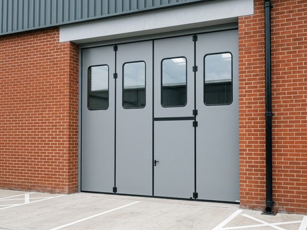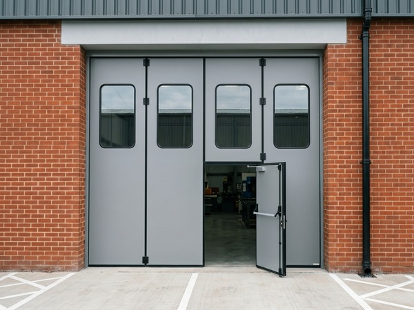 The thick insulated steel panels offer thermal and acoustic benefits that an old roller shutter simply cannot match, helping the client lower heat loss and cut energy costs across the production area. Because the door operates entirely on a top track, we eliminated the need for a floor track completely. This created a clean, trip free threshold for the staff walking through it during their shifts. We also integrated a highly practical cut wing pedestrian door right into one of the main leaves, providing effortless daily access without having to open the entire unit.