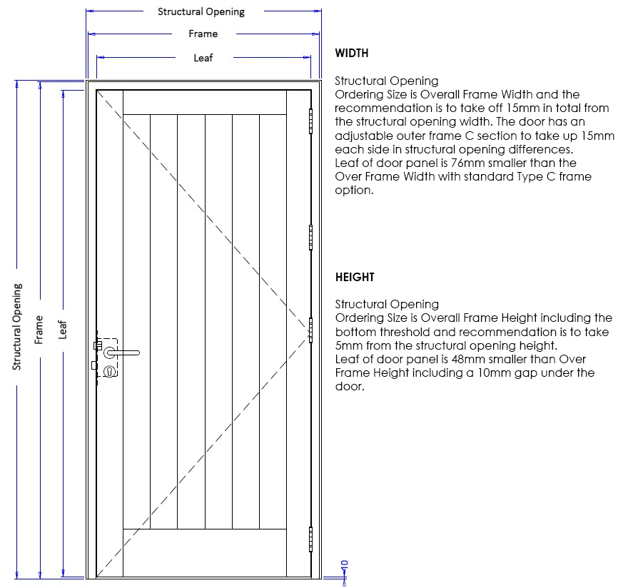 This means if your structural opening size is measured as 2200mm width and 2100mm height the door and frame ought to be 2190mm wide and 2090mm high with the frame and any threshold included. You make the final decision on tolerances required.