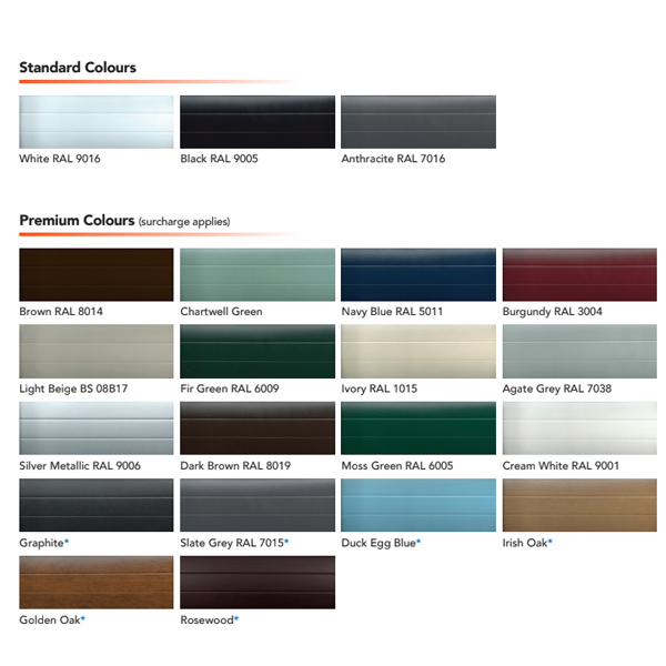 The door curtain is available in 3 standard and 8 premium and high quality powdercoated colours with optional half or full hood in a matching colour. If you require a contrasting hood or guides colour please call or email for details and pricing.