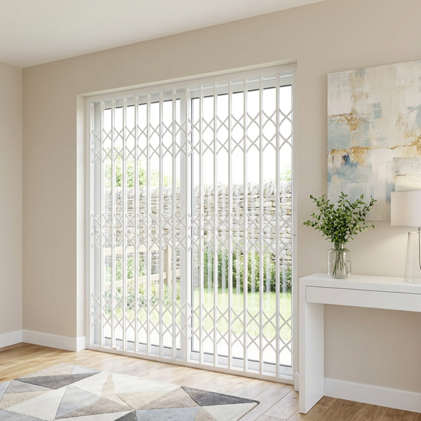 Ideal for securing large bi-folding door installations that open onto gardens, terraces, courtyards, or commercial frontages, providing a high level of security whilst retaining visibility and allowing natural light penetration even when the grille is locked in position.